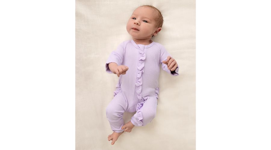 Der Gerippte Rüschen in der Farbe Misty Lavender Dieser hochwertige Baby-Schlafanzug vereint Stil und Komfort auf wunderbare Weise. Weiches Bambusgewebe schmiegt sich sanft an und hält Babys beim Schlafen und Nickerchen warm. Gerippte Details sorgen für Dehnbarkeit und Strapazierfähigkeit, während Rüschenakzente dem Schlafanzug einen charmanten Akzent verleihen. Eltern schätzen den praktischen, durchgehenden Reißverschluss, der das An- und Ausziehen sowie das Windelwechseln beschleunigt. Leicht und dennoch warm – dieser hochwertige Baby-Schlafanzug ist vielseitig, ideal zum Kombinieren mit anderen Kleidungsstücken oder solo getragen und ein unverzichtbares Basic für jede Babygarderobe.